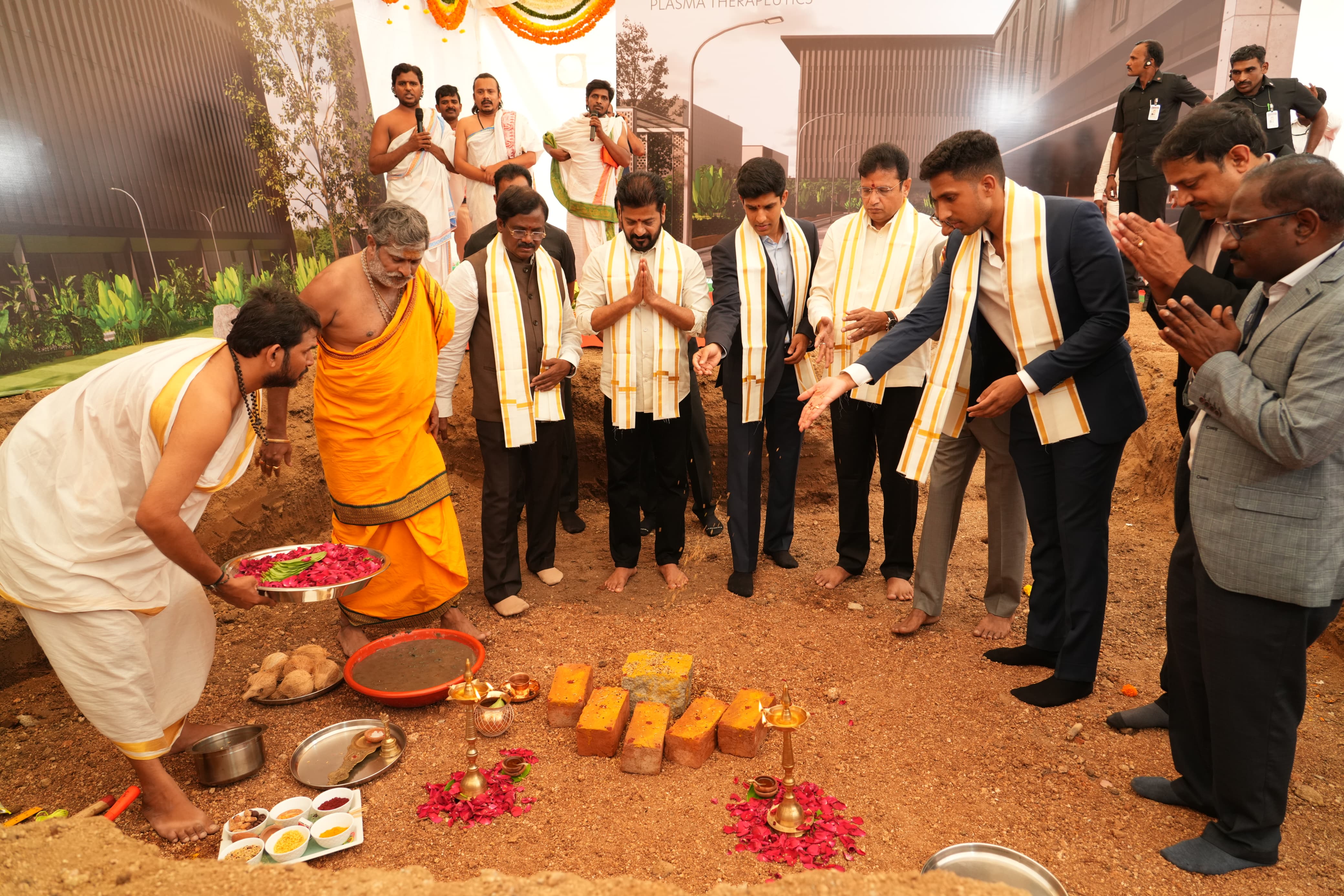 The Chief Minister performed the groundbreaking ceremony for the new unit of ICHOR Biologics at Genome Valley, Shamirpet. Ministers Duddilla Sridhar Babu, Vivek Venkataswamy, MLA P. Sudarshan Reddy, ICHOR Managing Director Sudini Ananda Reddy, along with officials and company staff, participated in the event.