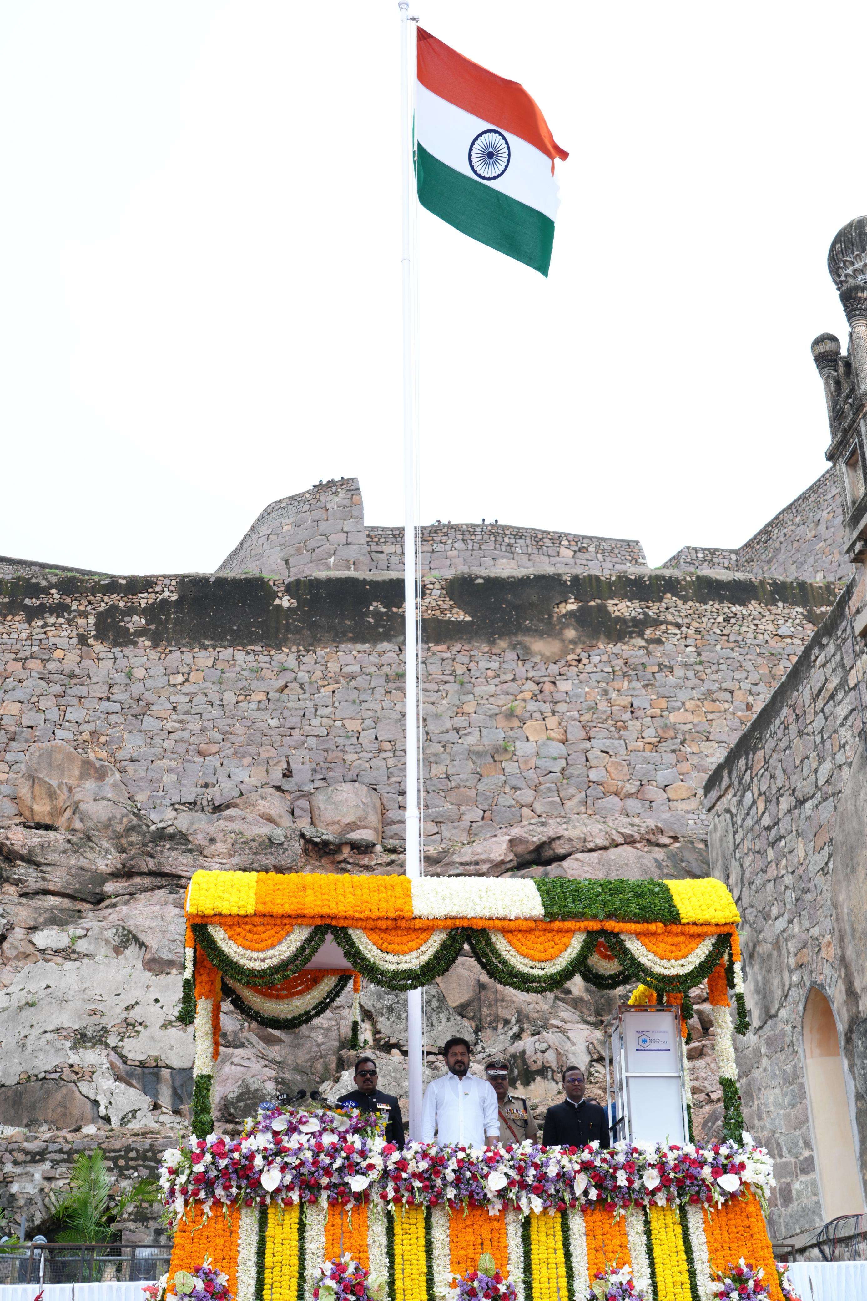 79 వ స్వాతంత్య్ర దినోత్సవ వేడుకల సందర్భంగా గోల్కొండ రాణిమహల్ లాన్స్లో ముఖ్యమంత్రి గారు గౌరవ వందనం స్వీకరించి జాతీయ పతాకాన్ని ఎగురవేశారు. తెలంగాణ రాష్ట్ర గీతాలాపన, సమ్మాన్ గార్డ్స్ కవాతు అనంతరం రాష్ట్ర ప్రజలను ఉద్దేశించి ముఖ్యమంత్రి గారు ప్రసంగించారు.