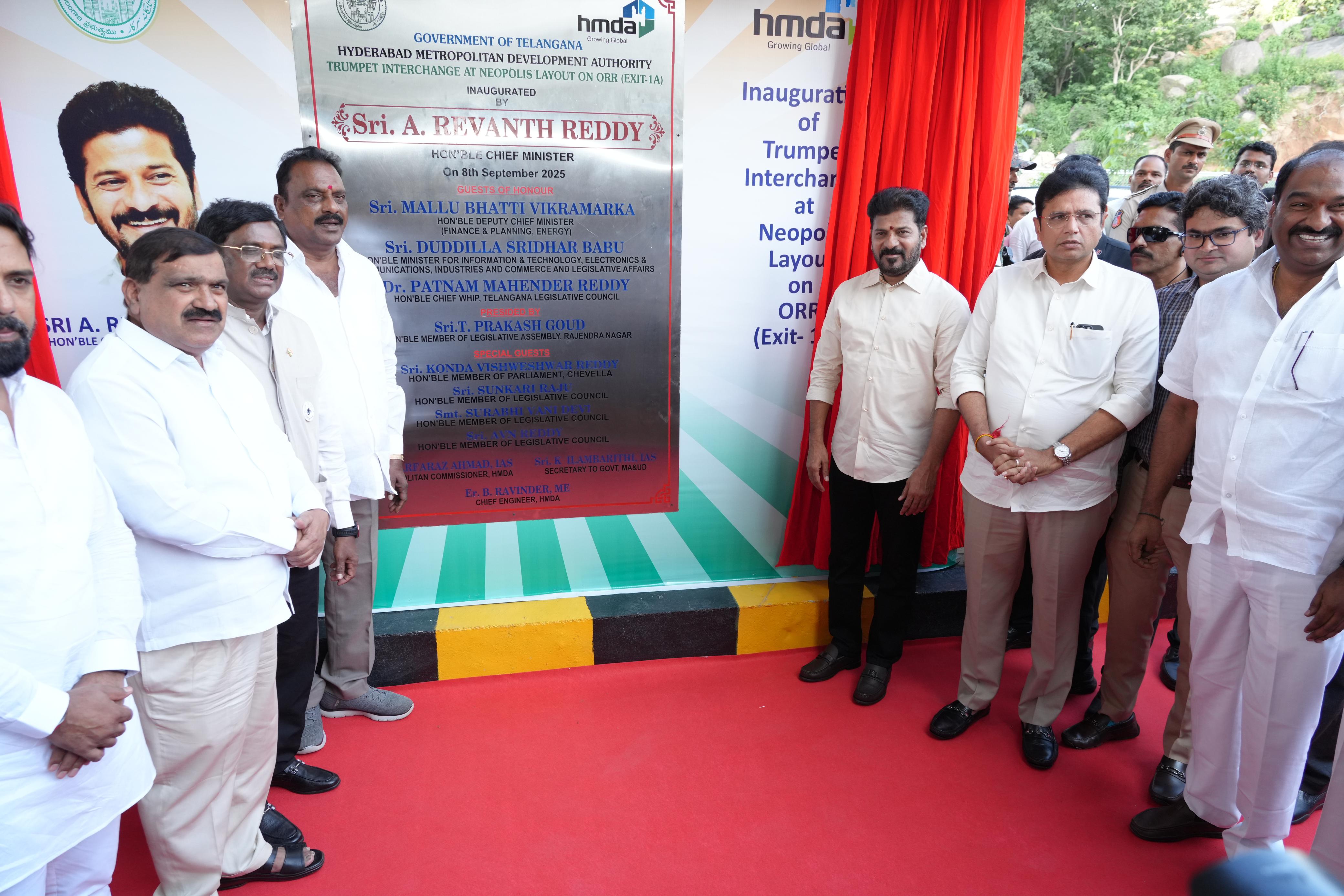 Hon’ble Chief Minister Shri A. Revanth Reddy inaugurated the Trumpet Interchange at Kokapet, constructed by the Hyderabad Metropolitan Development Authority (HMDA). The inauguration was held at a function organized at Kokapet Neopolis, connecting directly to the Outer Ring Road (Exit 1A).