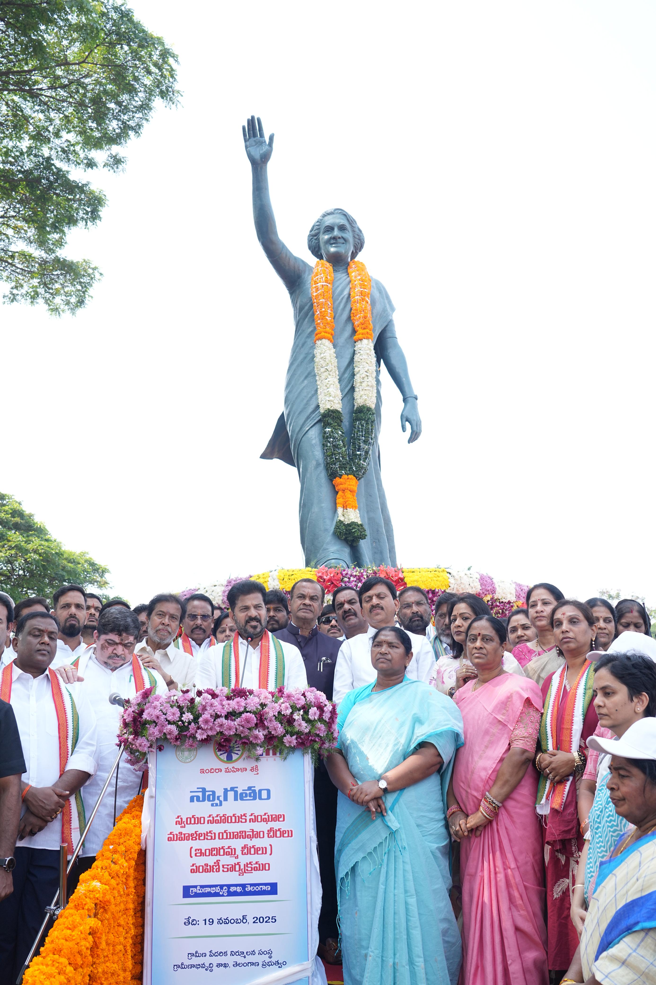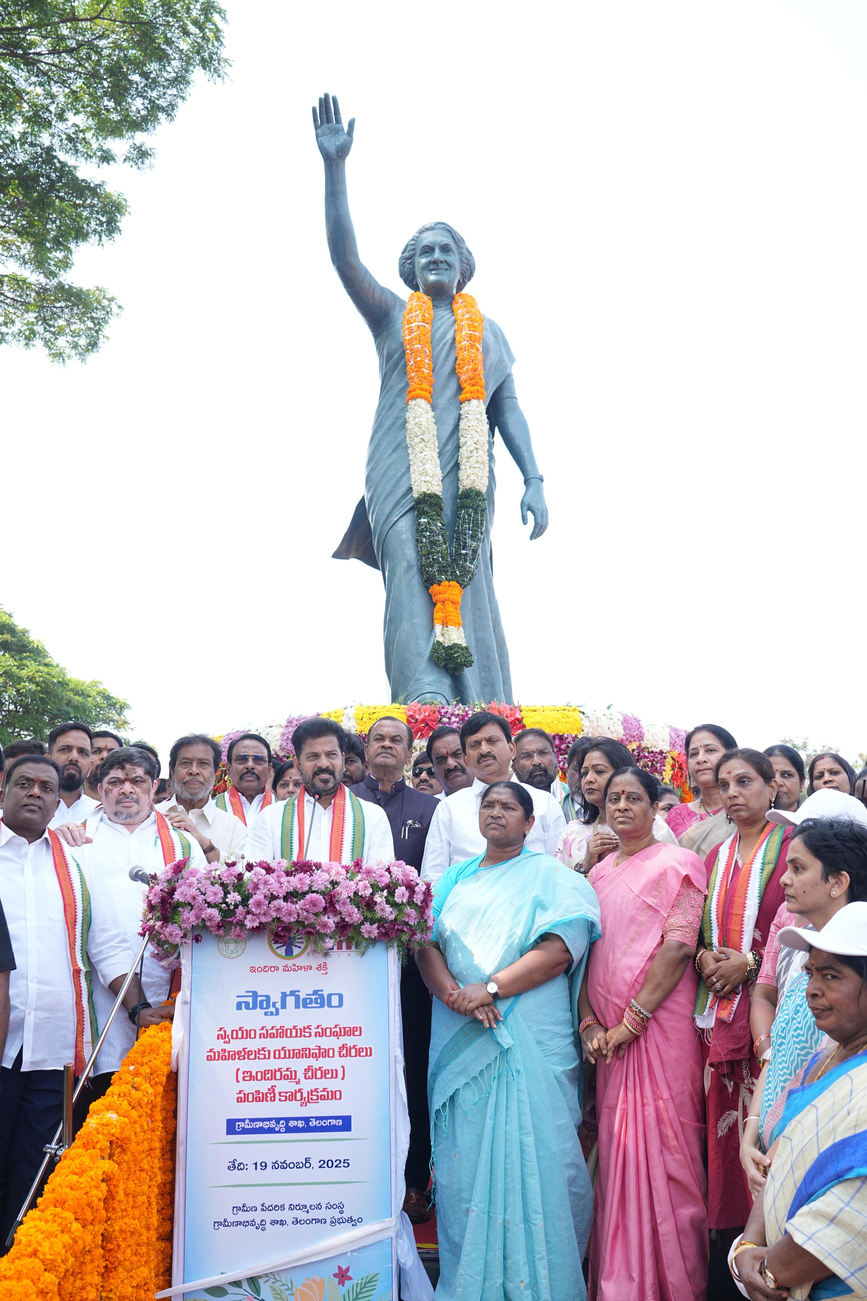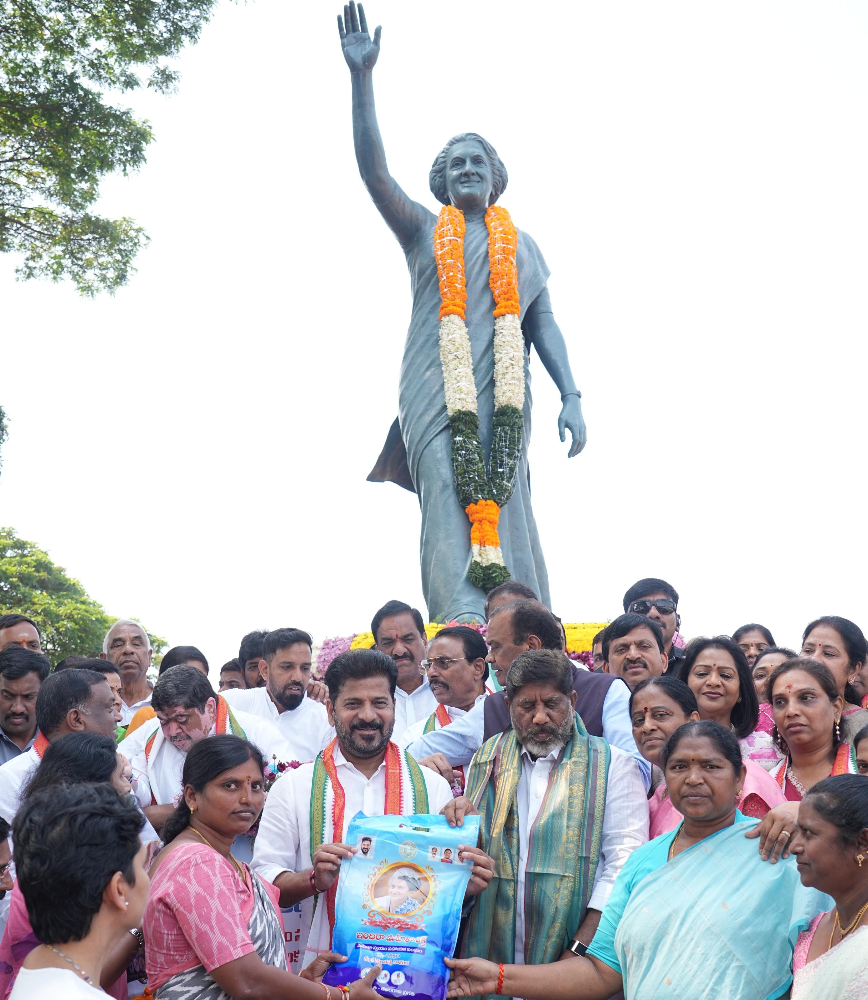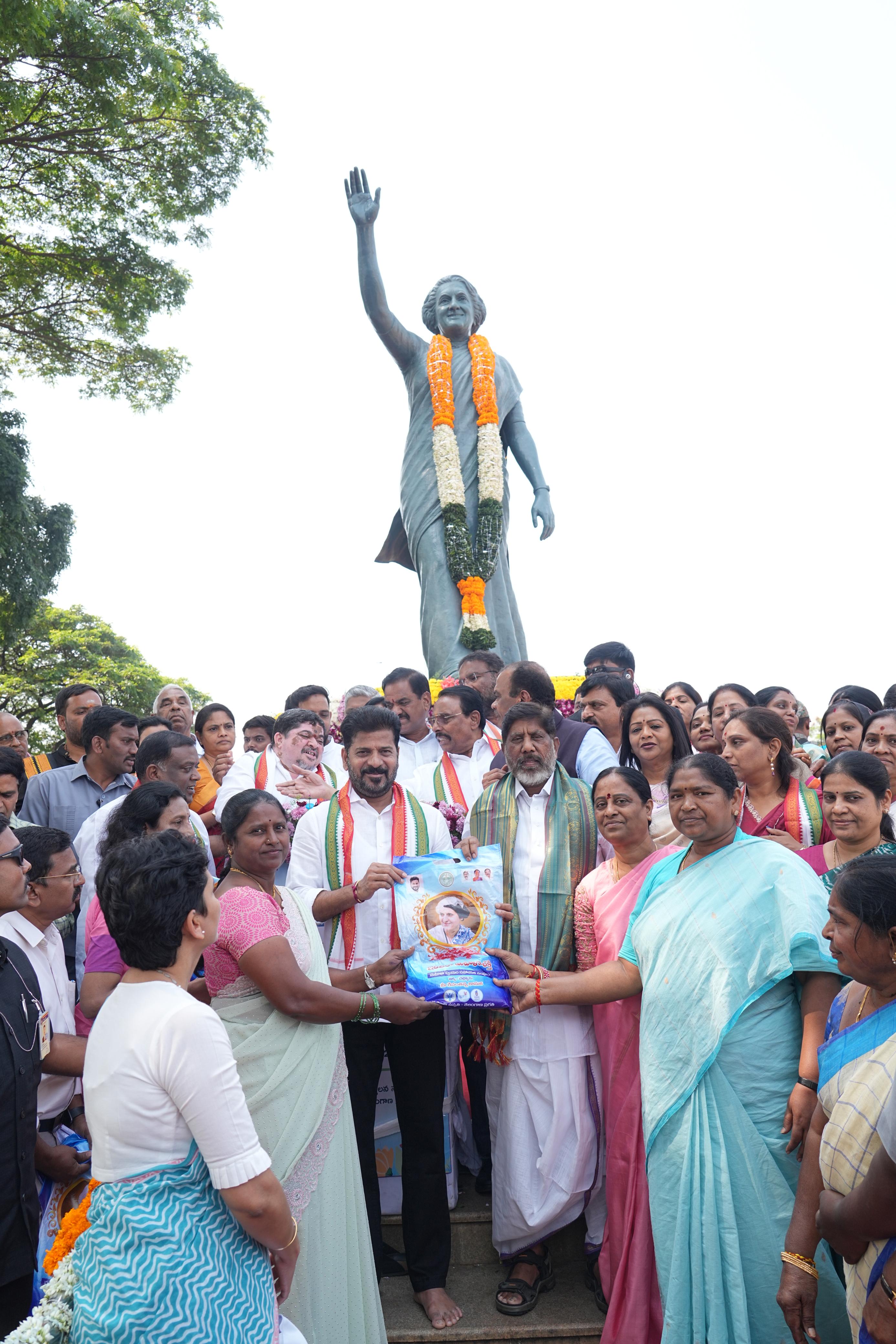 “ఇందిరా గాంధీ స్ఫూర్తితోనే స్థానిక సంస్థల్లో మహిళలకు రిజర్వేషన్లతో పాటు మహిళా సంఘాలకు జీరో వడ్డీ రుణాలు, పెట్రోల్బంక్లు అప్పగించడం, 500 రూపాయలకే గ్యాస్ సిలిండర్, ఆర్టీసీలో ఉచిత ప్రయాణ సౌకర్యమే కాకుండా బస్సులకు యజమానులను కూడా ఆడబిడ్డలను చేశాం. సోలార్ పవర్ ప్లాంట్లు అందించడానికి ప్రత్యేక కార్యాచరణలో ముందుకు వెళుతున్నాం.