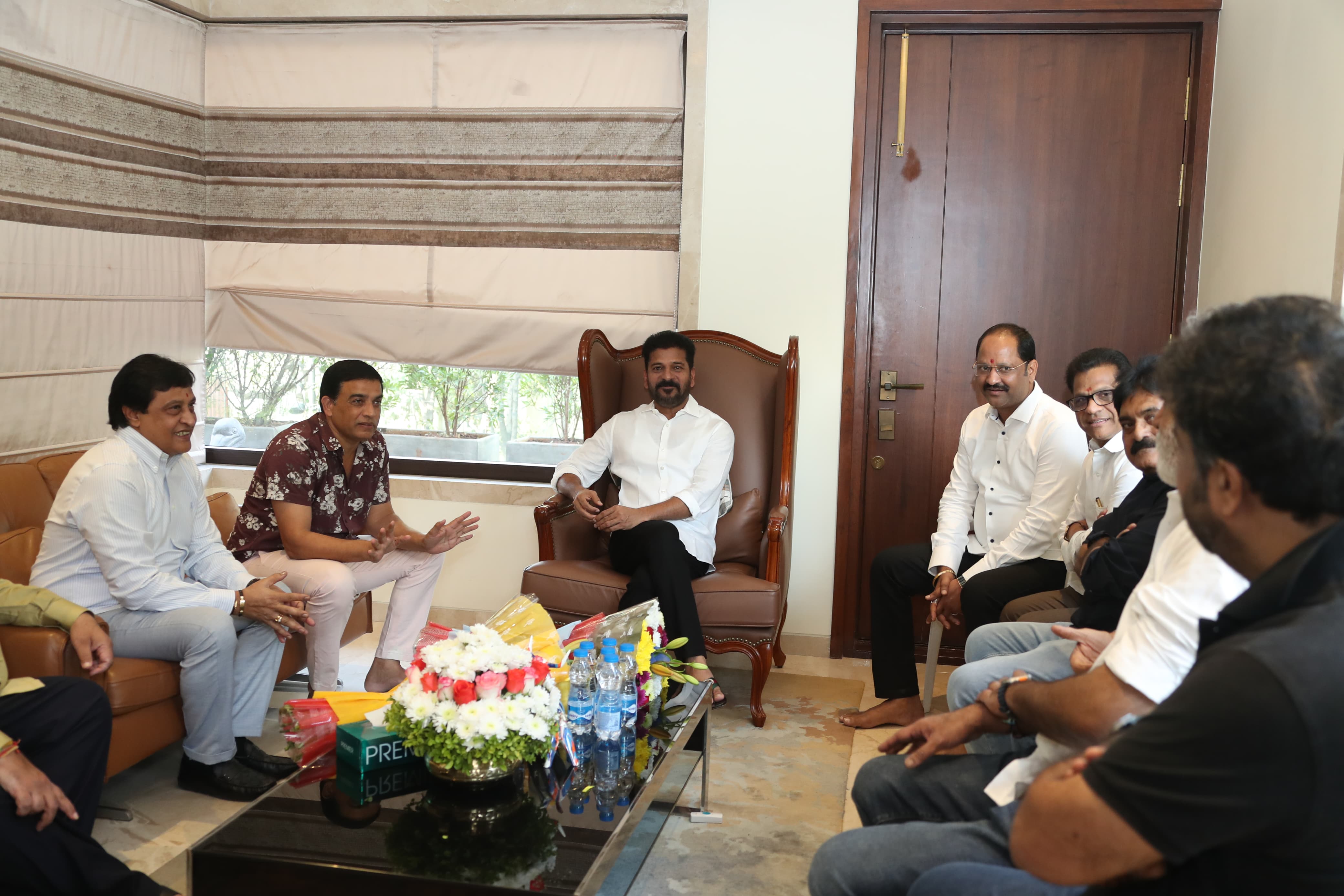 సీఎంను కలిసిన తెలుగు ఫిలిం ఛాంబర్ ఆఫ్ కామర్స్ ప్రెసిడెంట్ శ్రీ దిల్ రాజు, తెలుగు ఫిలిం ప్రొడ్యూసర్స్ కౌన్సిల్ ప్రెసిడెంట్ శ్రీ కెఎల్ దామోదర ప్రసాద్, కౌన్సిల్ సెక్రెటరీ శ్రీ వైవీఎస్ చౌదరి, తెలంగాణ స్టేట్ ఫిలిం ఛాంబర్ ఆఫ్ కామర్స్ ప్రెసిడెంట్ శ్రీ సునీల్ నారాయణ, సెక్రటరీ శ్రీమతి కె. అనుపమ రెడ్డి, ఎంప్లాయిస్ ఫెడరేషన్ ప్రెసిడెంట్ శ్రీ అనిల్ కుమార్, సెక్రెటరీ టీఎస్ఎన్ శ్రీ దొర, ప్రొడ్యూసర్స్ గిల్డ్ ప్రెసిడెంట్ శ్రీ పీవీ రవి కిషోర్, ట్రెజరర్ శ్రీ బాపినీడు, శ్రీమతి సుప్రియ.