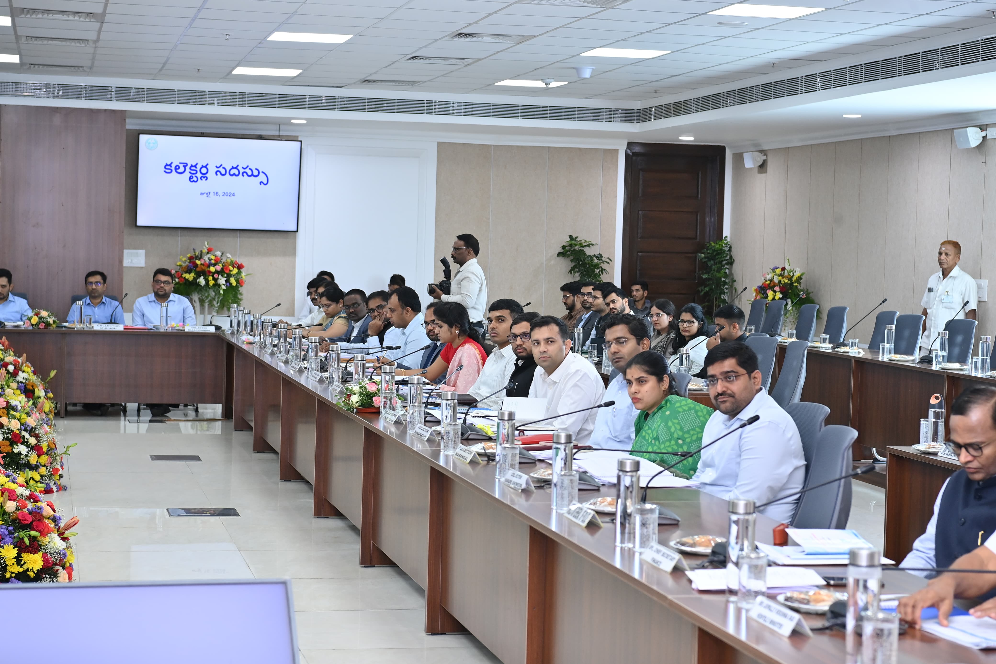 సచివాలయంలో మంగళవారం జరిగిన జిల్లా కలెక్టర్ల సదస్సులో ముఖ్యమంత్రి రేవంత్ రెడ్డి తో పాటు డిప్యూటీ సీఎం భట్టి విక్రమార్క, మంత్రులు ఉత్తమ్ కుమార్ రెడ్డి, పొంగులేటి శ్రీనివాసరెడ్డి, శ్రీధర్ బాబు, దామోదర రాజనర్సింహ, పొన్నం ప్రభాకర్, కోమటిరెడ్డి వెంకట్ రెడ్డి, జూపల్లి కృష్ణారావు, తుమ్మల నాగేశ్వరరావు, సీతక్క, కొండా సురేఖ, రాష్ట్ర ప్రణాళిక బోర్డు ఉపాద్యక్షుడు చిన్నారెడ్డి, ముఖ్యమంత్రి సలహాదారు వేం నరేందర్ రెడ్డి పాల్గొన్నారు. మంత్రి పొంగులేటి శ్రీనివాసరెడ్డి సదస్సును ప్రారంభించగా, డిప్యూటీ సీఎం భట్టి విక్రమార్క ప్రారంభోపన్యాసం చేశారు. ప్రభుత్వ ప్రధాన కార్యదర్శి శాంతికుమారితో పాటు అన్ని శాఖల కార్యదర్శులు, అన్ని జిల్లాల కలెక్టర్లు ఈ సమావేశంలో పాల్గొన్నారు.