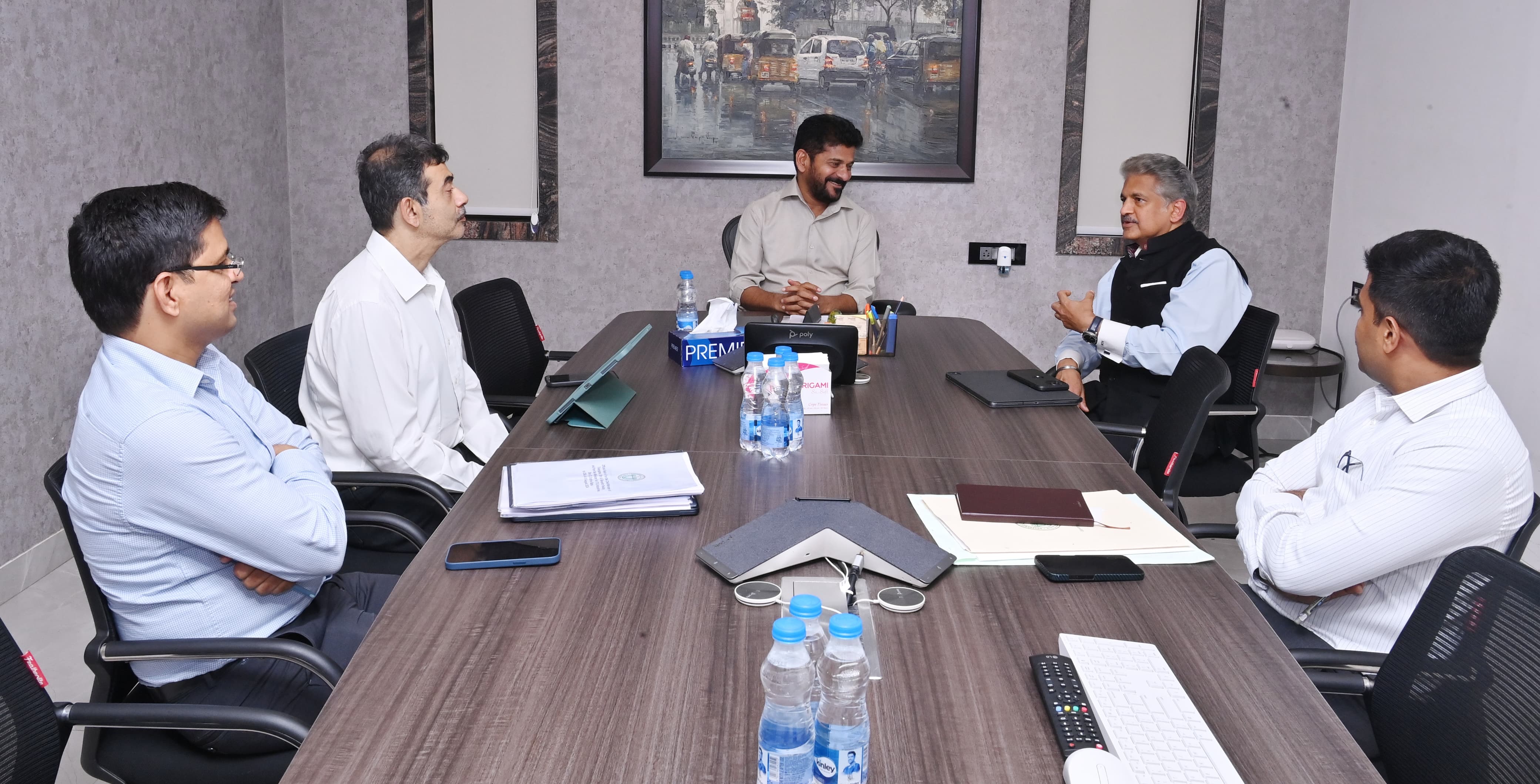 జూబ్లీహిల్స్ నివాసంలో ముఖ్యమంత్రి శ్రీ రేవంత్ రెడ్డి గారితో మహీంద్రా గ్రూప్, మహీంద్రా & మహీంద్రా లిమిటెడ్, టెక్ మహీంద్రా లిమిటెడ్ చైర్మన్ శ్రీ ఆనంద్ మహీంద్రా మర్యాదపూర్వక భేటీ. రాష్ట్రంలో మహీంద్రా గ్రూప్ పెట్టుబడులు, ఇతర అంశాలపై చర్చ.
