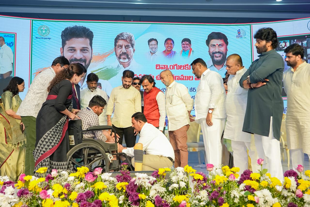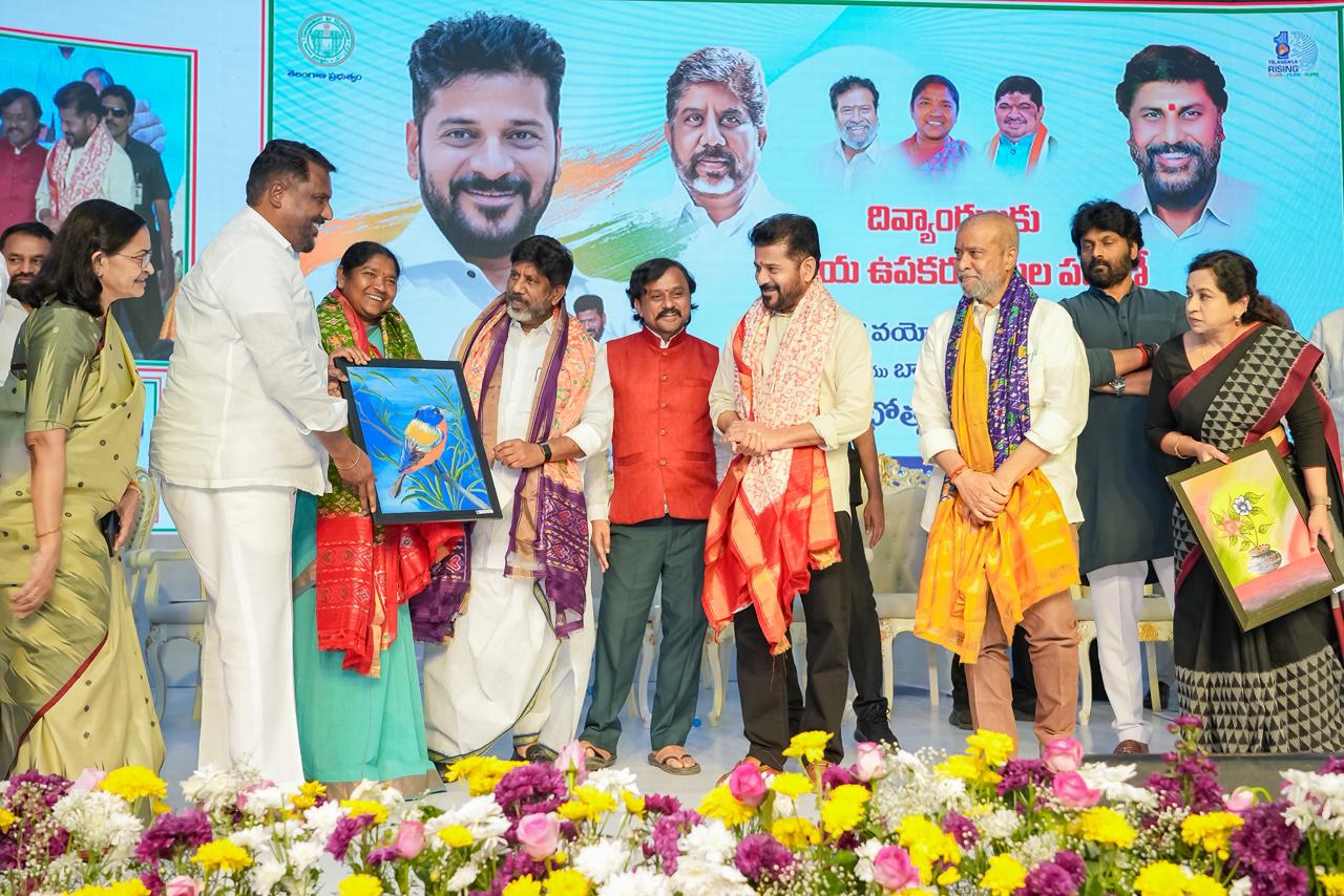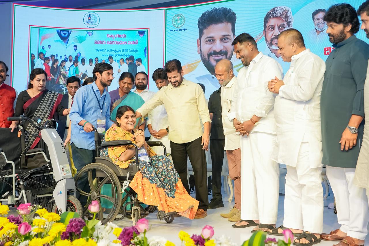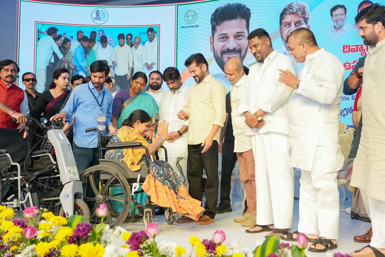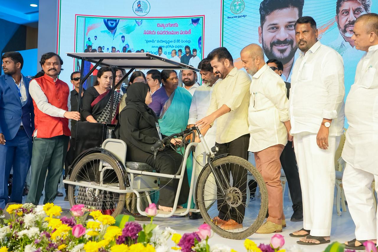 At a program held at Jyotirao Phule Praja Bhavan, the Chief Minister distributed retrofitted motorized vehicles, battery-operated tricycles, battery wheelchairs, laptops, hearing aids, mobile phones, and other assistive devices to persons with disabilities. Deputy Chief Minister Mallu Bhatti Vikramarka, Ministers Damodara Rajanarasimha, Danasari Anasuya Seethakka, and Adluri Lakshman Kumar, along with public representatives and officials, participated in the event.
