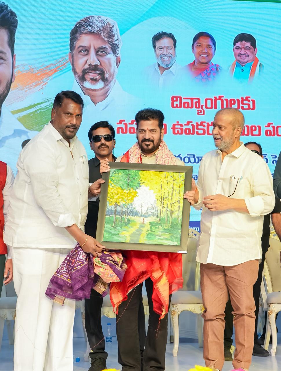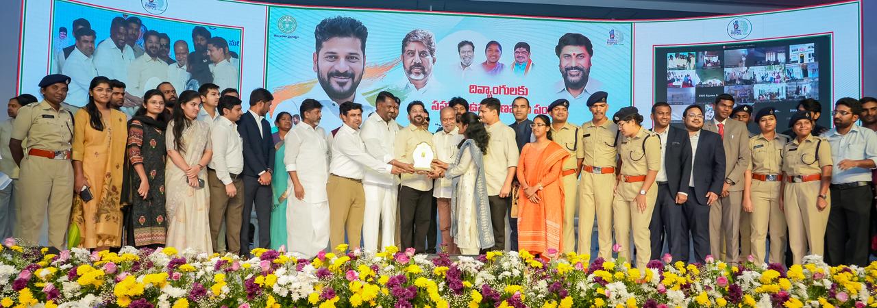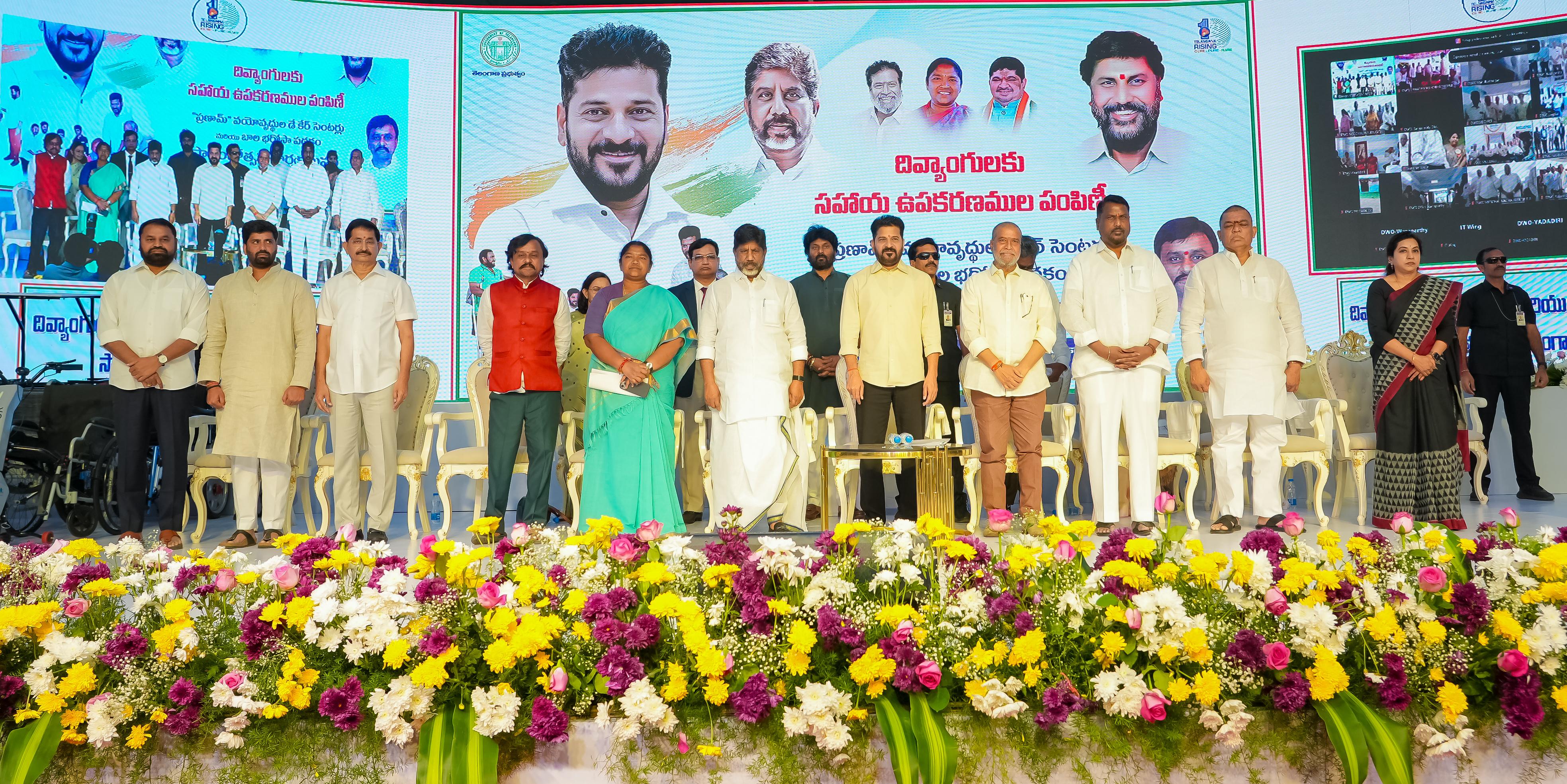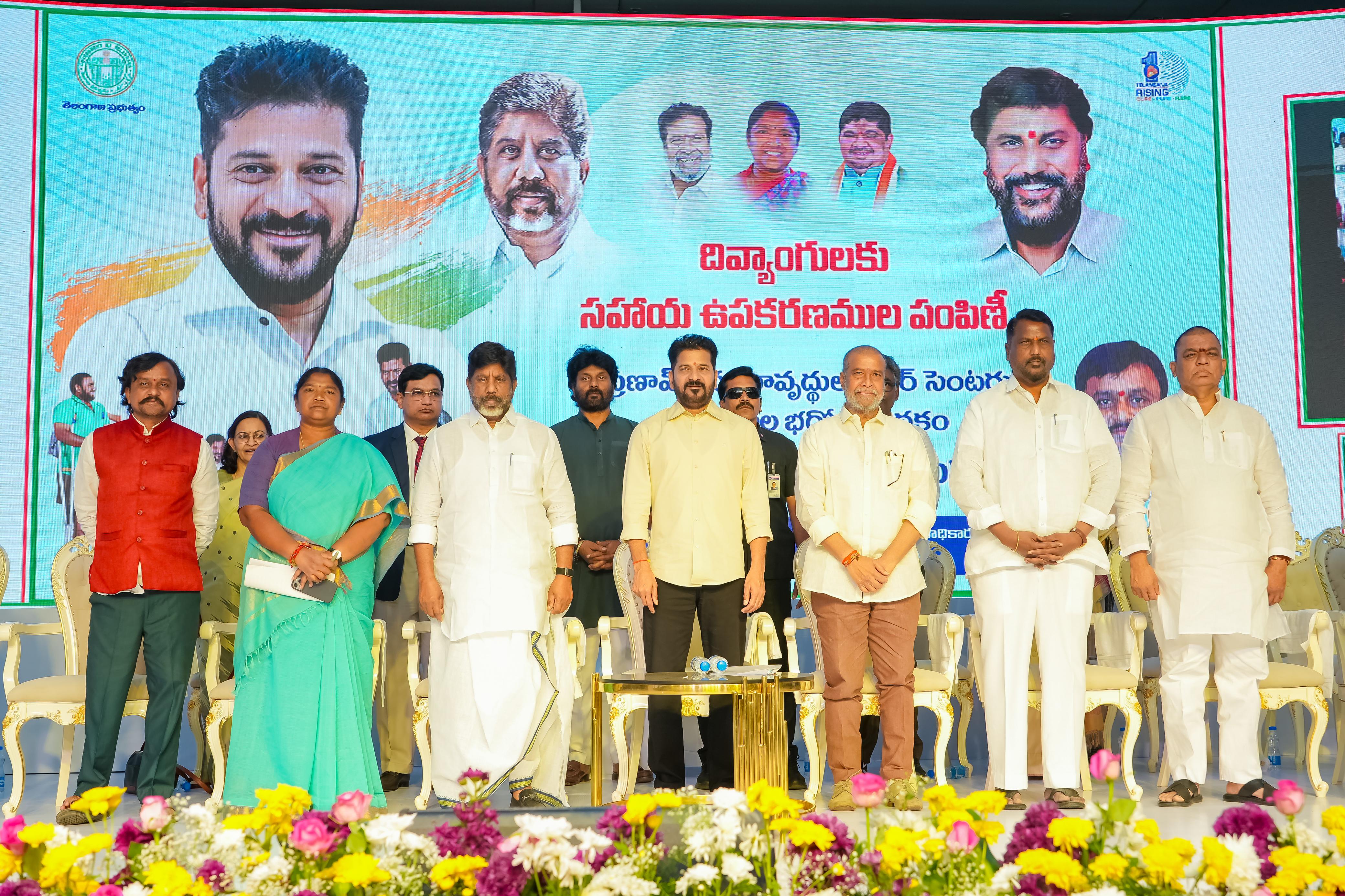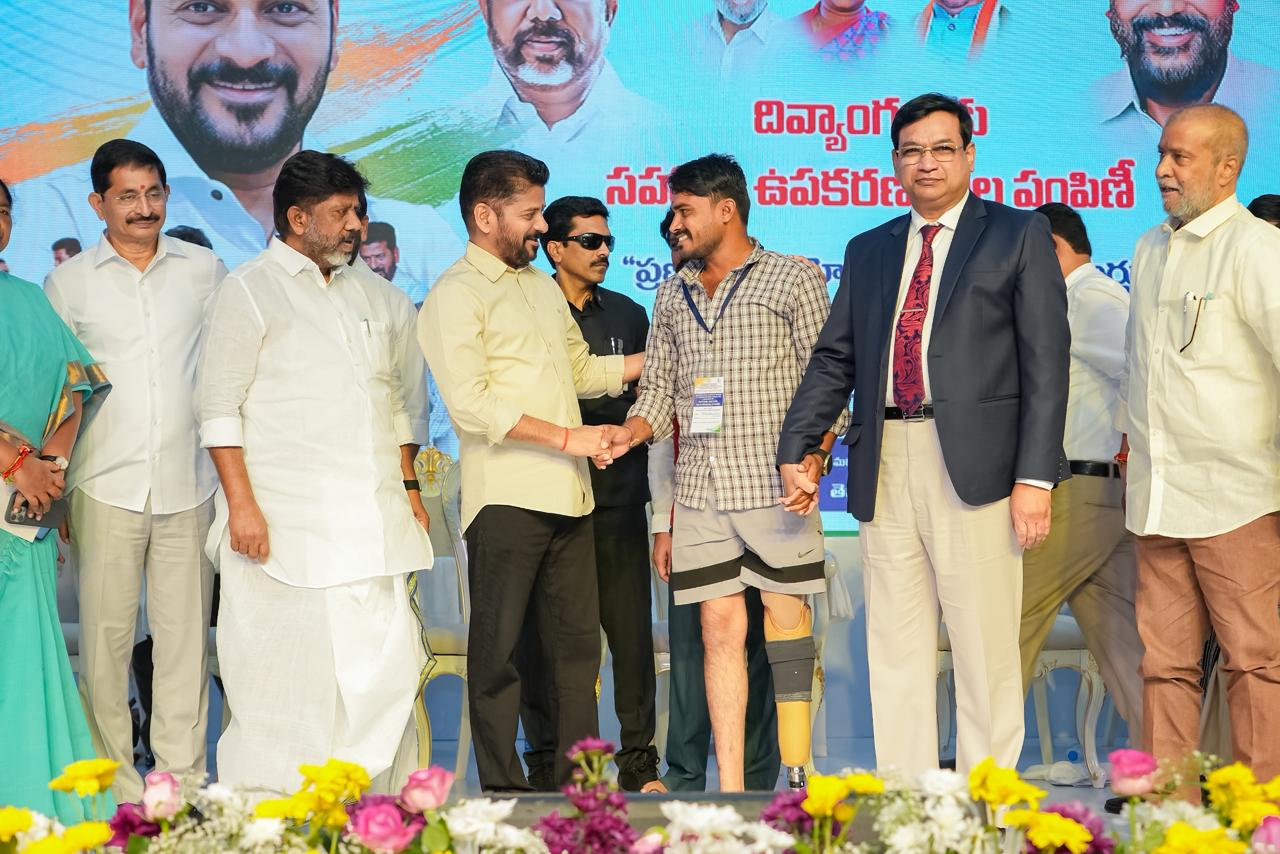 At a program held at Jyotirao Phule Praja Bhavan, the Chief Minister distributed retrofitted motorized vehicles, battery-operated tricycles, battery wheelchairs, laptops, hearing aids, mobile phones, and other assistive devices to persons with disabilities. Deputy Chief Minister Mallu Bhatti Vikramarka, Ministers Damodara Rajanarasimha, Danasari Anasuya Seethakka, and Adluri Lakshman Kumar, along with public representatives and officials, participated in the event.