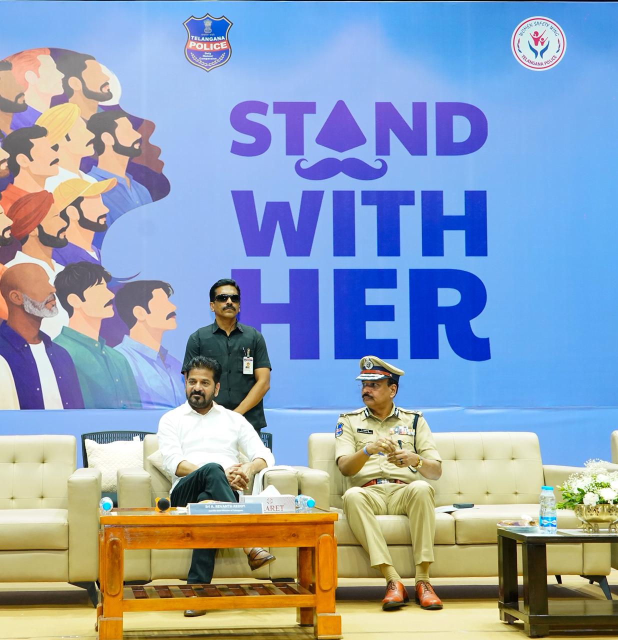 హైదరాబాద్ జేఎన్టీయూ క్యాంపస్ ఆడిటోరియంలో తెలంగాణ పోలీస్ మహిళా భద్రతా విభాగం ఆధ్వర్యంలో నిర్వహించిన “స్టాండ్ విత్ హర్” క్యాంపెయిన్ ప్రారంభ కార్యక్రమంలో ముఖ్యమంత్రి గారు పాల్గొన్నారు. Stand With Her క్యాంపెయిన్ బ్రోచర్ను ఆవిష్కరించారు. మహిళల భద్రత, గౌరవం, సమానత్వాన్ని కాపాడడంలో పురుషులు బాధ్యతాయుతమైన పాత్ర పోషించాల్సిన అవసరాన్ని తెలియజేయడమే లక్ష్యంగా ఈ కార్యక్రమాన్ని చేపట్టిన విమెన్ సేఫ్టీ విభాగాన్ని ముఖ్యమంత్రి గారు అభినందించారు.