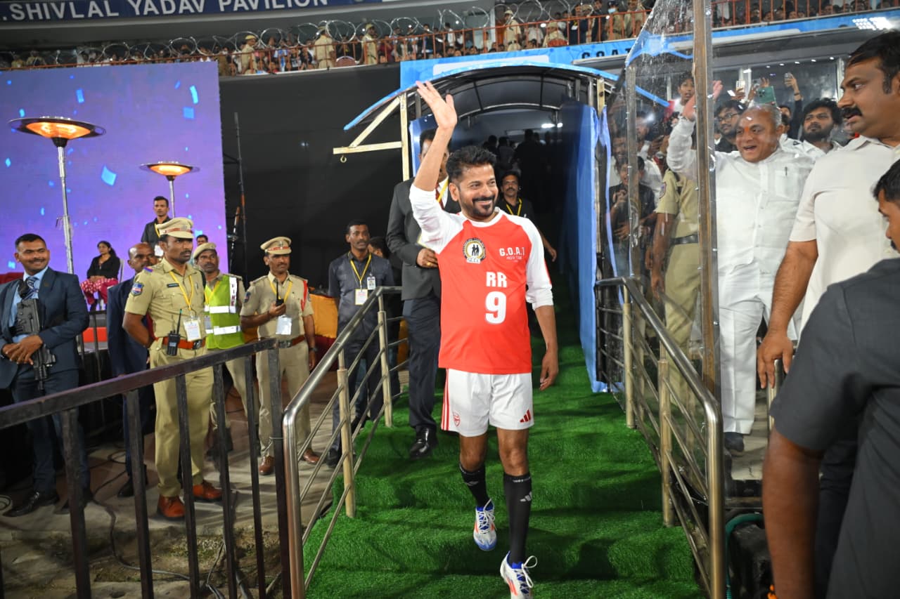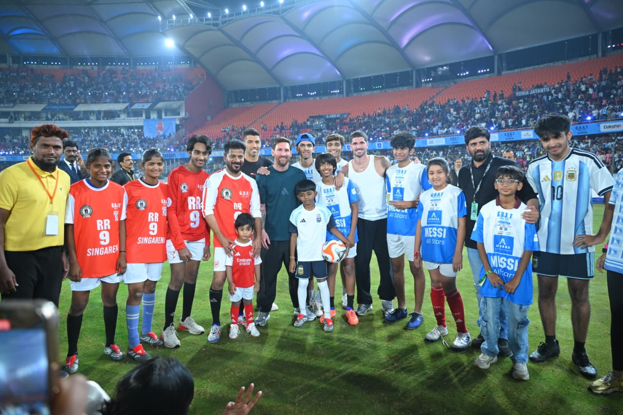 The world football legend and Argentina captain Lionel Messi, whose arrival had been eagerly awaited for many days, thrilled sports fans at the Rajiv Gandhi International Stadium in Uppal, Hyderabad. From the moment Messi stepped onto the field, the exhibition football match captured the audience’s attention from start to finish. Hon’ble Chief Minister Sri A. Revanth Reddy scored a goal for the Singareni RR-9 team, becoming one of the highlights of the event.